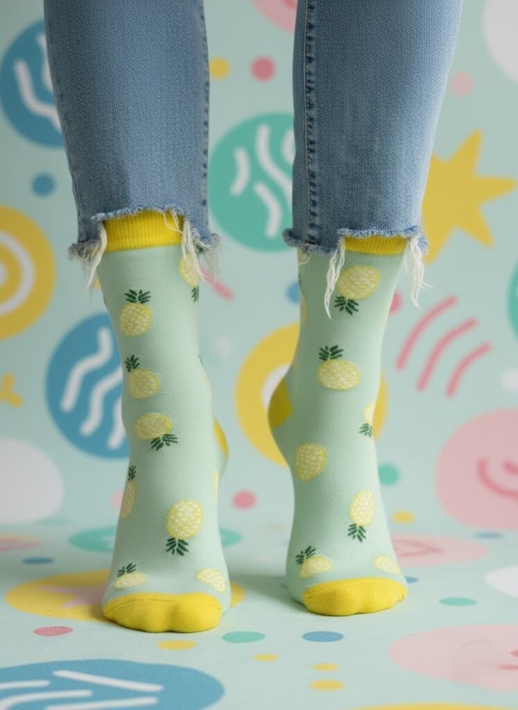 Enerjik Stil: Ananas desenimizin canlı renkleri ve eğlenceli motifleri ile ruh halinizi anında yükseltin. İster görünür ister ayakkabının içinde olsun, her anınıza pozitif bir hava katın.