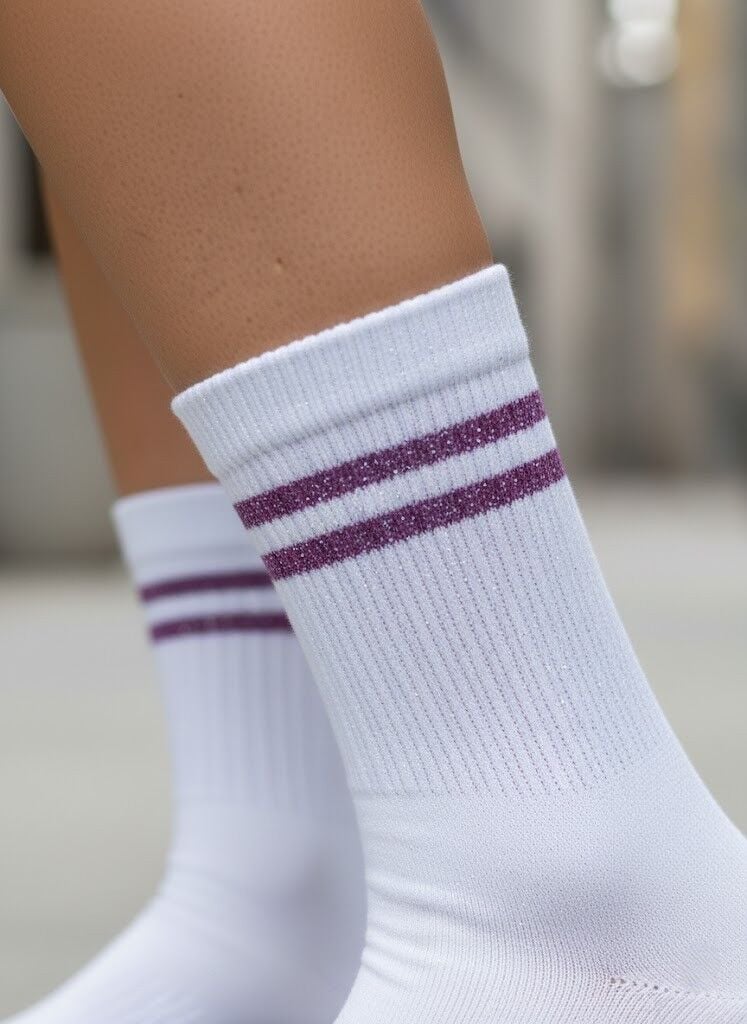 Beyaz-Mor (Simli) Çizgili Kolej Çorap