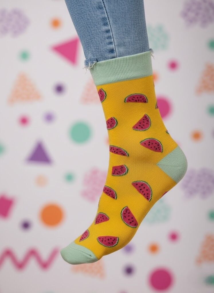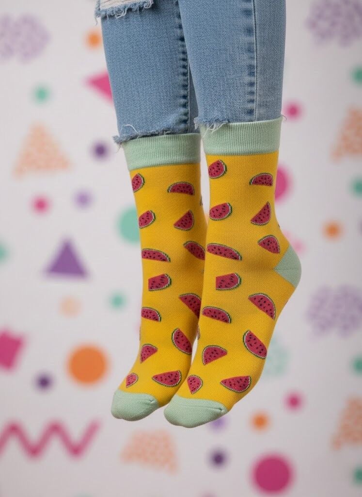 Enerjik Stil: Karpuz Dilimi desenimizin canlı renkleri ve eğlenceli motifleri ile ruh halinizi anında yükseltin. İster görünür ister ayakkabının içinde olsun, her anınıza pozitif bir hava katın.