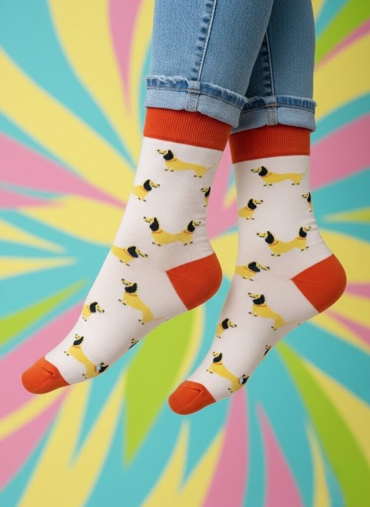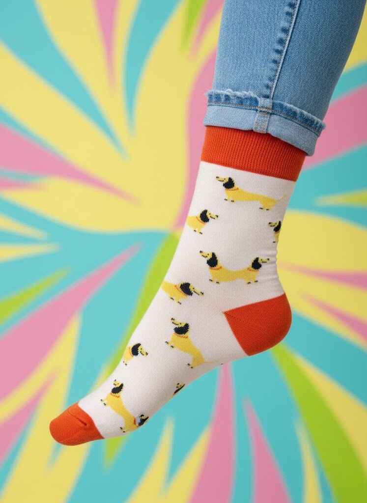Enerjik Stil: Köpek desenimizin canlı renkleri ve eğlenceli motifleri ile ruh halinizi anında yükseltin. İster görünür ister ayakkabının içinde olsun, her anınıza pozitif bir hava katın.