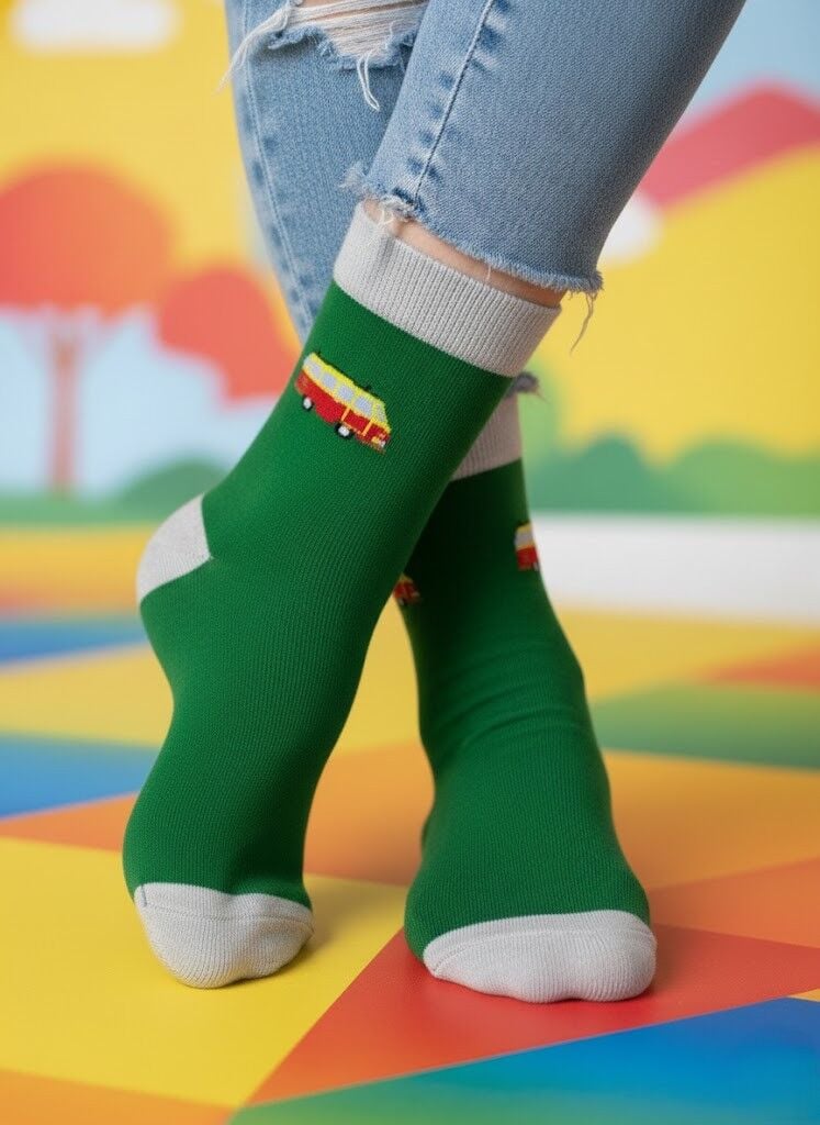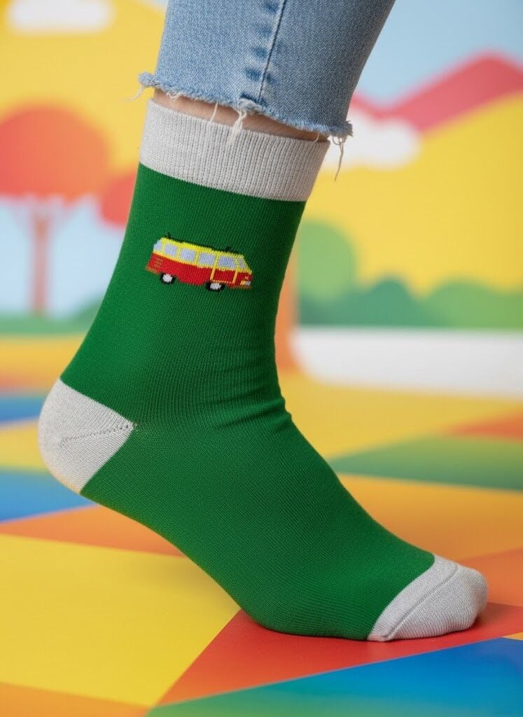 Enerjik Stil: Minibüs desenimizin canlı renkleri ve eğlenceli motifleri ile ruh halinizi anında yükseltin. İster görünür ister ayakkabının içinde olsun, her anınıza pozitif bir hava katın.