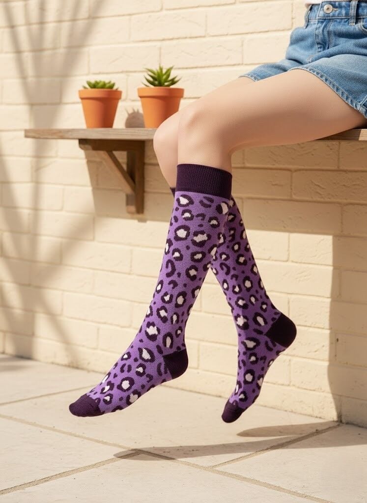 Mor Leopar Desenli Çocuk Dizaltı Çorap