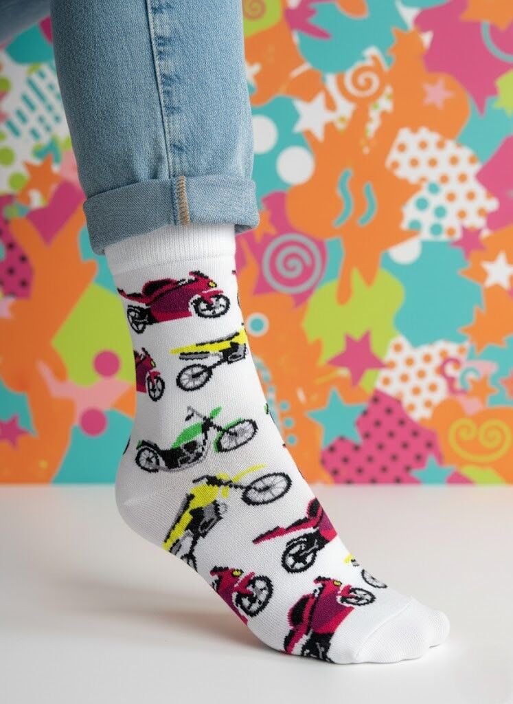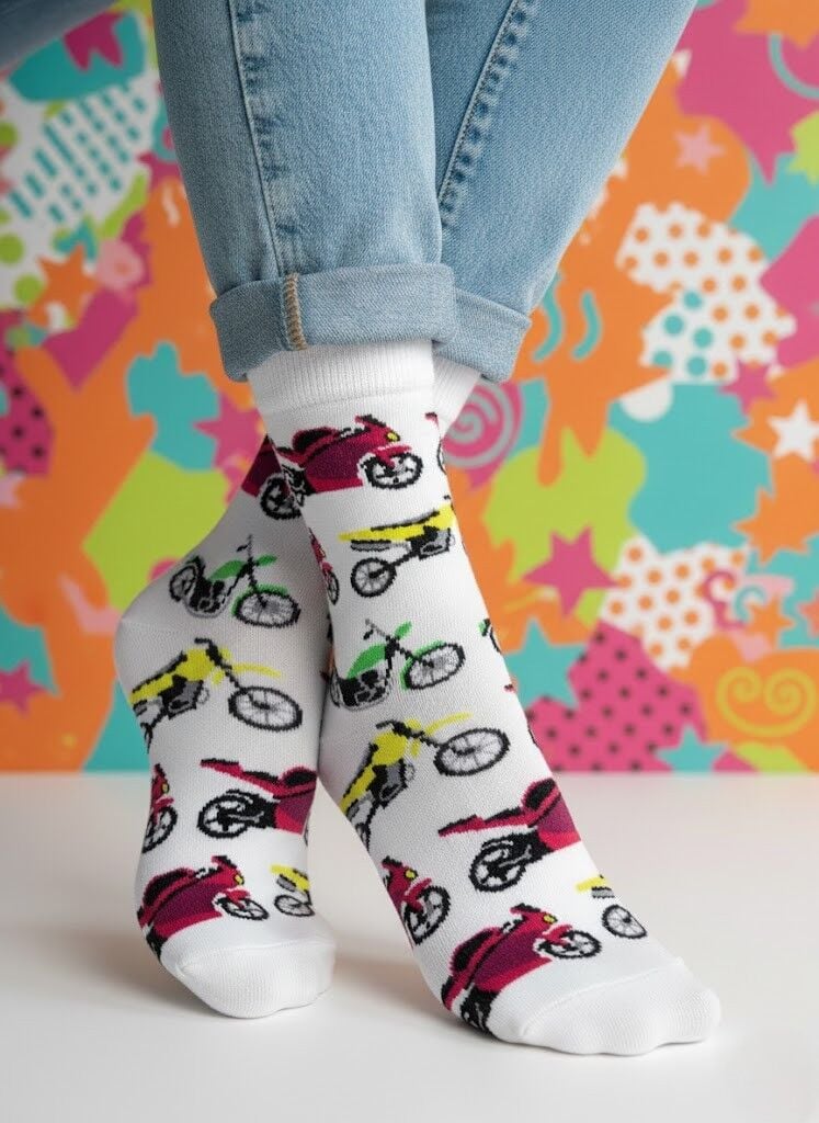 Enerjik Stil: Motosiklet desenimizin canlı renkleri ve eğlenceli motifleri ile ruh halinizi anında yükseltin. İster görünür ister ayakkabının içinde olsun, her anınıza pozitif bir hava katın.