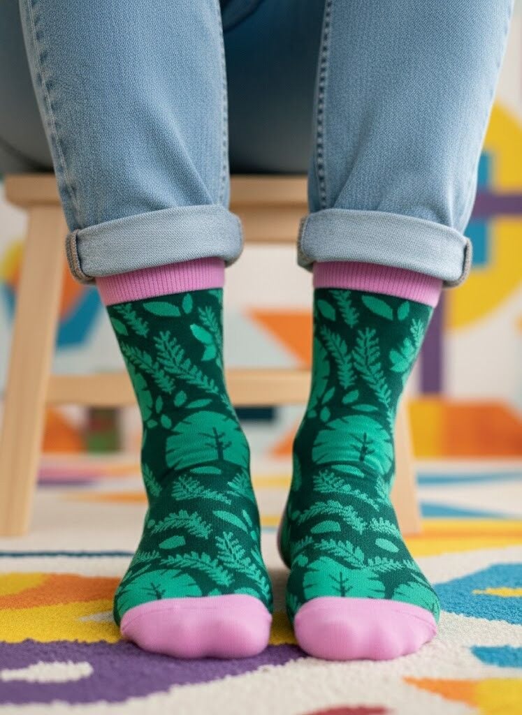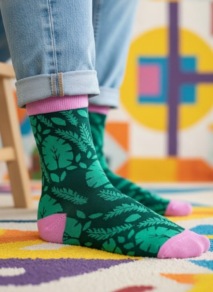 Enerjik Stil: Palmiye Yapraklı desenimizin canlı renkleri ve eğlenceli motifleri ile ruh halinizi anında yükseltin. İster görünür ister ayakkabının içinde olsun, her anınıza pozitif bir hava katın.