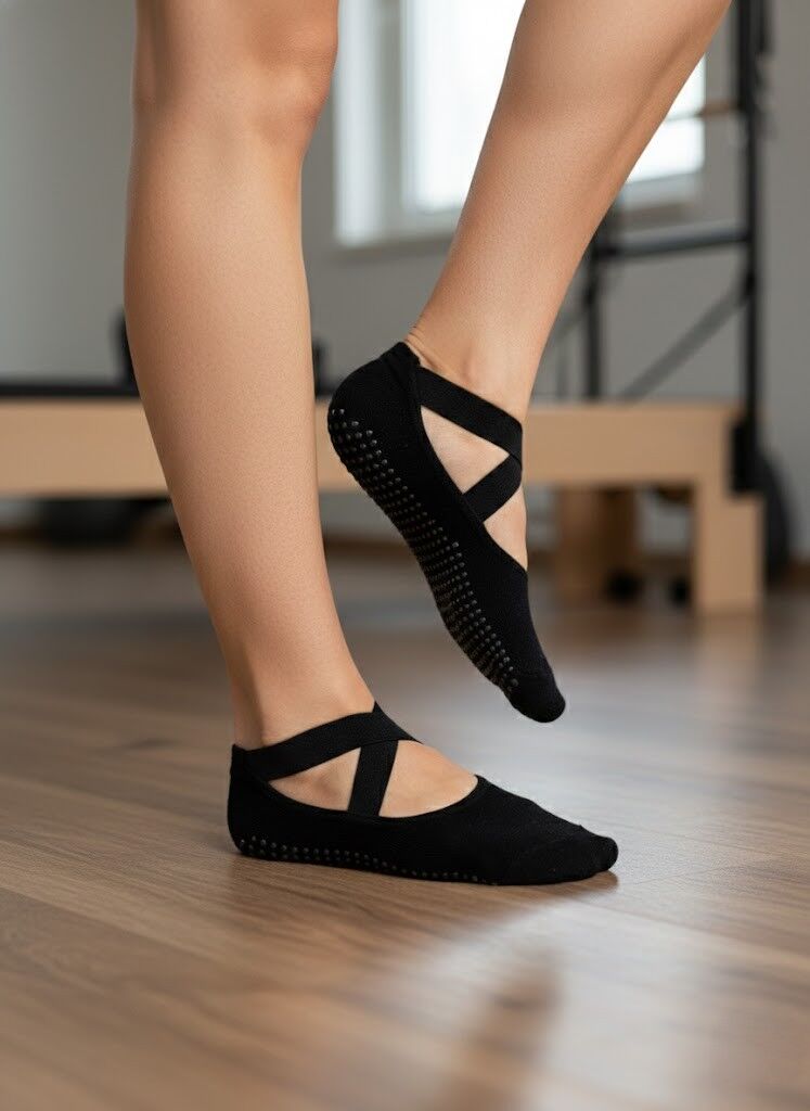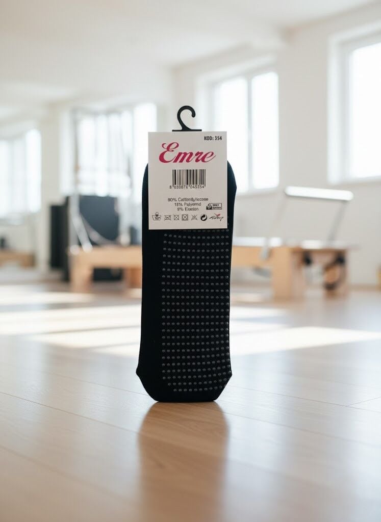 Stüdyoda hem şıklığınızı hem de güvenliğinizi koruyun! Ayağın üst kısmını açıkta bırakan zarif çapraz bant tasarımı ile maksimum hareket özgürlüğü sunar. %80 Pamuk içeriğiyle ayaklarınızın nefes almasını sağlarken, tüm tabanı kaplayan kaymaz silikon noktacıkları sayesinde en zorlu pozlarda bile zemine sağlam basmanızı garantiler.