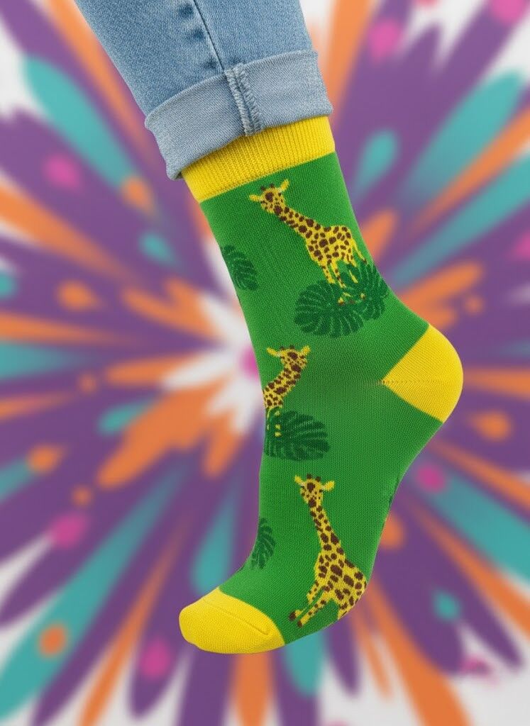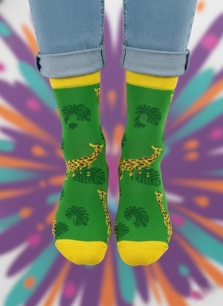 Enerjik Stil: Zürafa desenimizin canlı renkleri ve eğlenceli motifleri ile ruh halinizi anında yükseltin. İster görünür ister ayakkabının içinde olsun, her anınıza pozitif bir hava katın.
